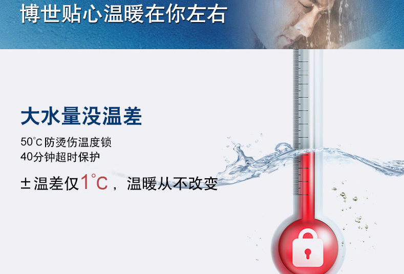 智能恒溫控制系統(tǒng),記憶合金先進(jìn)技術(shù),安全探測報(bào)警系統(tǒng),提供舒適安全沐浴。