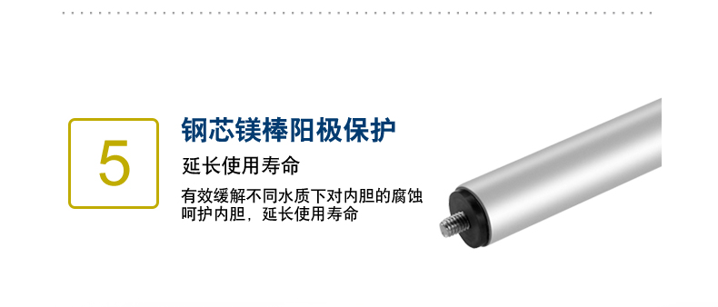 鋼芯強(qiáng)力陽極棒,有效緩解不同水質(zhì)下對(duì)內(nèi)膽的腐蝕,大大延長熱水器的使用壽命。