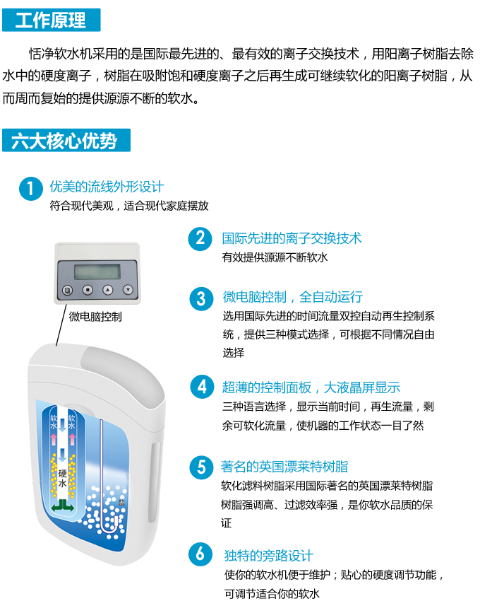 Tendge恬凈中央軟水機采用的軟水技術(shù)是目前最先進的、最有效的離子交換技術(shù),采用離子交換技術(shù)去除水中的硬度離子,防止水垢生成并提高用水的舒適度。